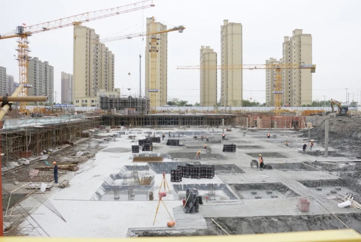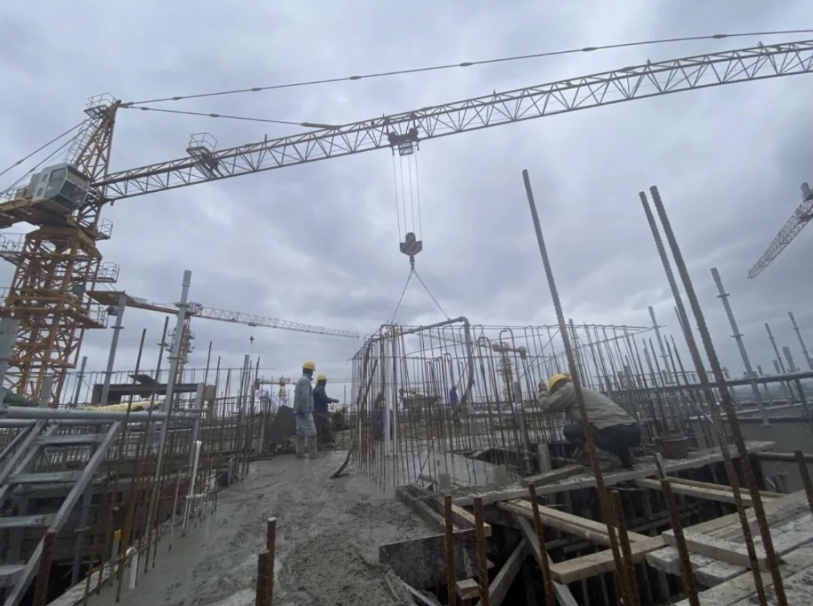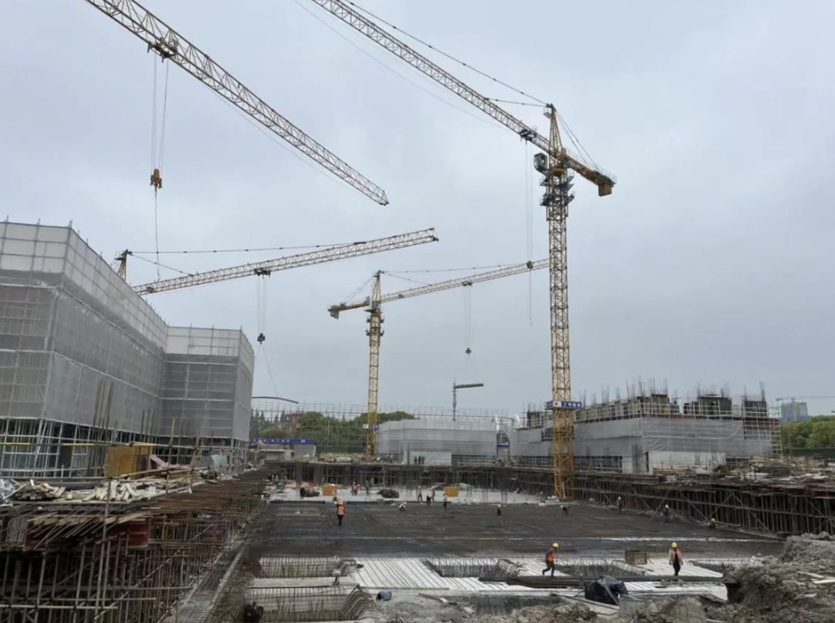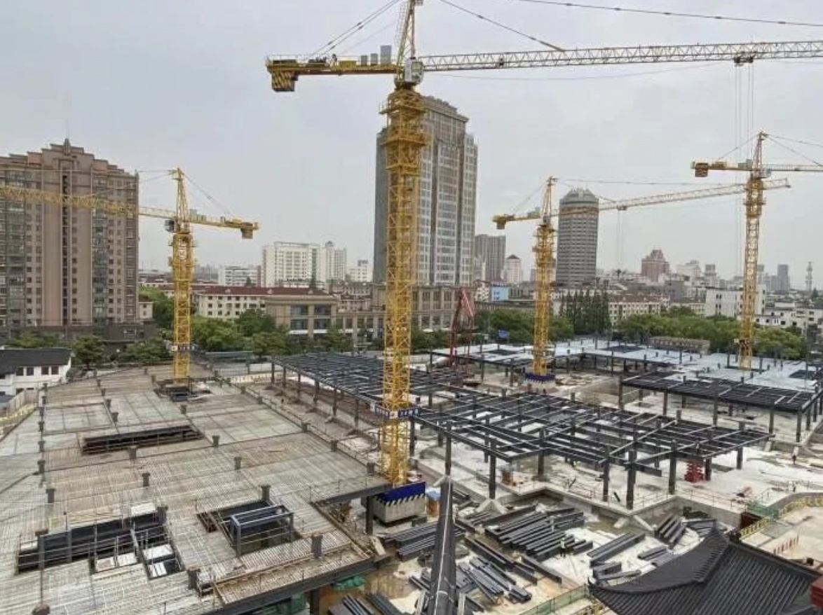 ▲“三古”城市更新项目,商城(09—04B)地块,地下室结构顶板完成,地上2—3层钢结构施工,累计完成28%,地下负2层二结构完成85%。山庄(09—02)地块,地下室结构顶板完成;地库区域钢结构2—3层施工,2层楼层板浇筑完成,累计完成30%;5#北侧扩建部分、6#主体结构完成,楼承板完成100%,屋面板铺装;7#—12#屋面保温、防水基本完成,二结构砌筑。