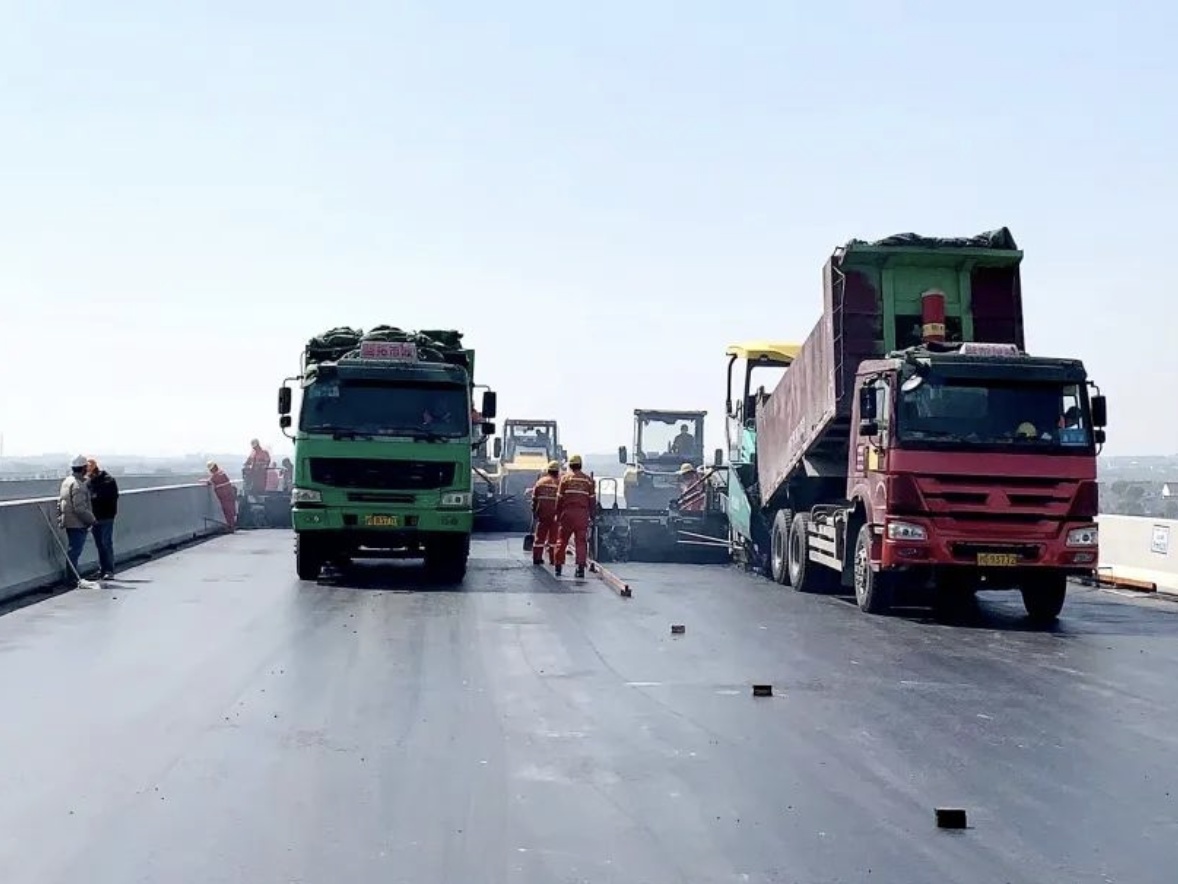 ▲S3公路(周邓公路—G1503公路两港大道立交)新建工程高速系统路面工程2标总体施工顺利,水稳基层完成12%,桥面抛丸完成70%,桥面防水完成67%,AC—20C沥青摊铺完成57%,SMA—13沥青摊铺完成26%,工程总体完成44%。