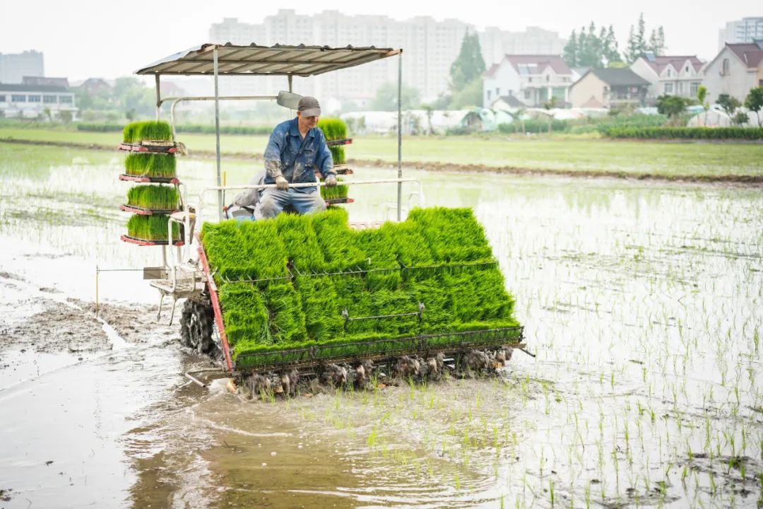 “绿水油油记插秧,转头风露稻花香。”5月18日清晨,在浦江镇的上海谷杰粮食专业合作社的稻田中,伴随着机器轰隆轰隆的响声,一台台装载着嫩绿色秧苗的插秧机在农田里来回穿梭,首批秧苗正齐刷刷地“坐”在水田里“安营扎寨”,田间地头一派生机勃勃的景象。这也标志着,闵行首批国庆稻开始陆续插秧。