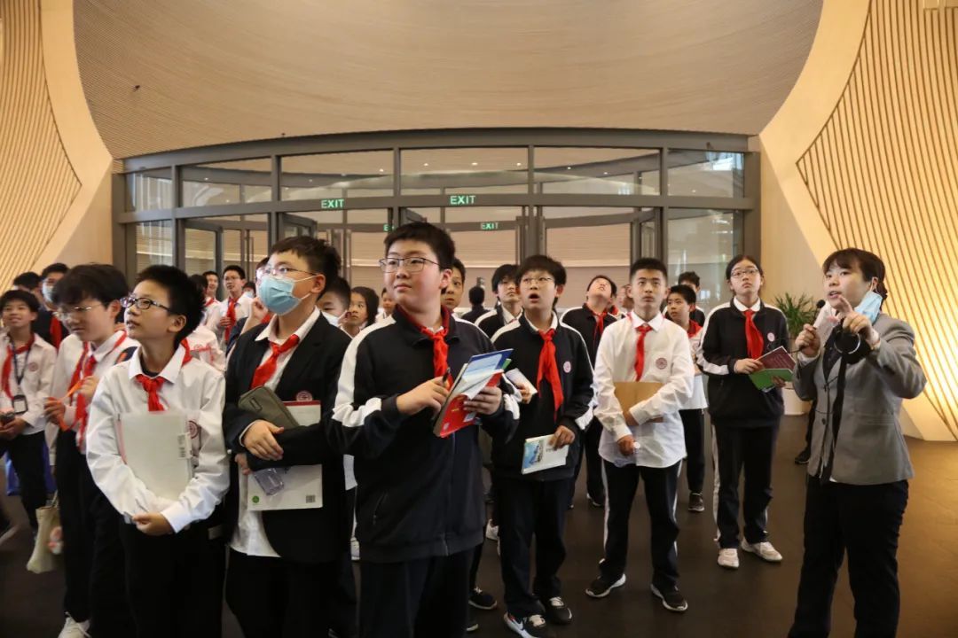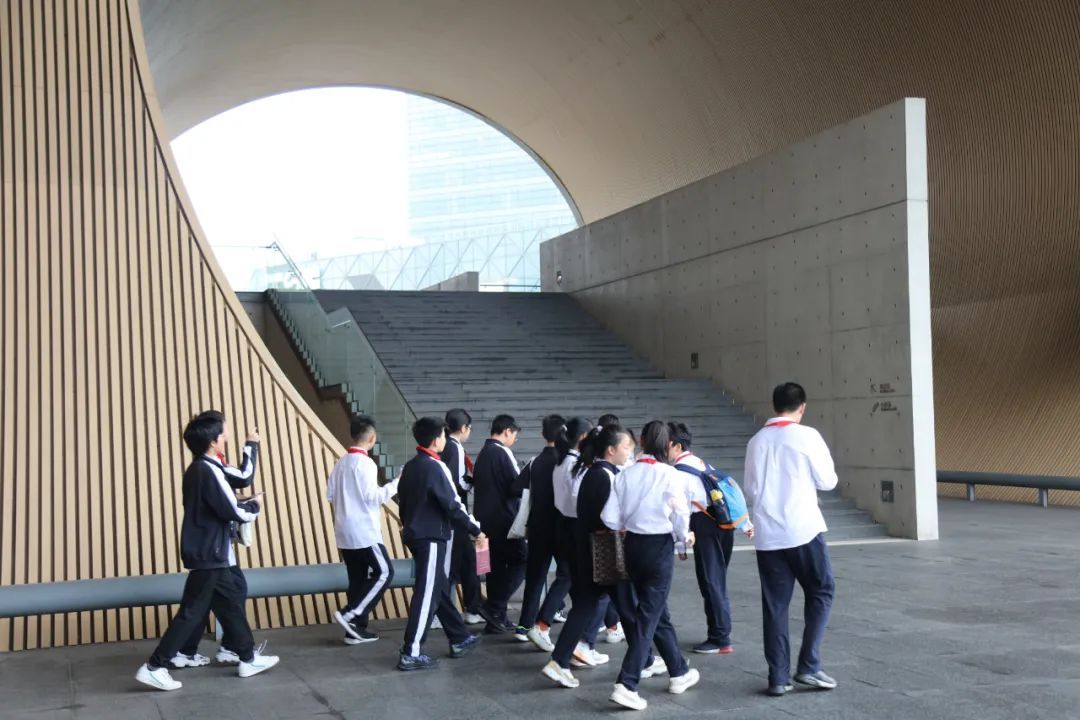 “剧院内部是由五个圆筒相互交错的,刚才我们走进来可以看到它是一个竖向的巨大正圆筒……”走进上海保利大剧院,学生们满眼都是好奇与兴奋。沿着长长的走廊,大家依次来到小剧场和室外剧场,了解剧院使用场景的同时,也感受到建筑的功能性和艺术审美的融合。