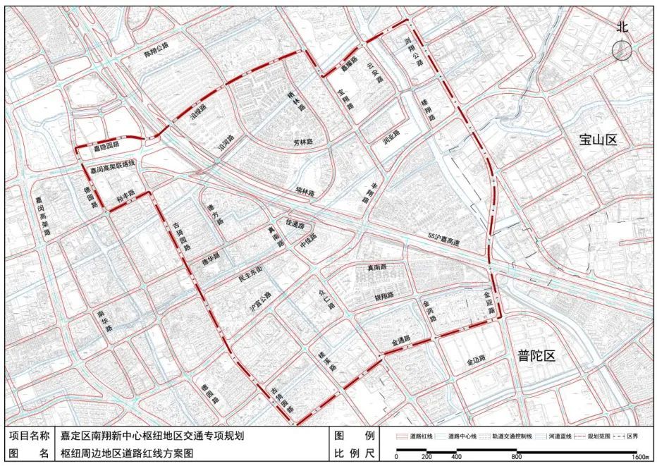 落实规划范围内的轨道交通控制线,并结合枢纽地区道路系统规划布局要求和道路工程设计方案,对规划范围内S5沪嘉快速路、沪宜公路、丰翔路、真南路、银翔路、金润路、瑞林路、德华路、古猗园路、裕丰路等局部路段的道路红线进行调整。