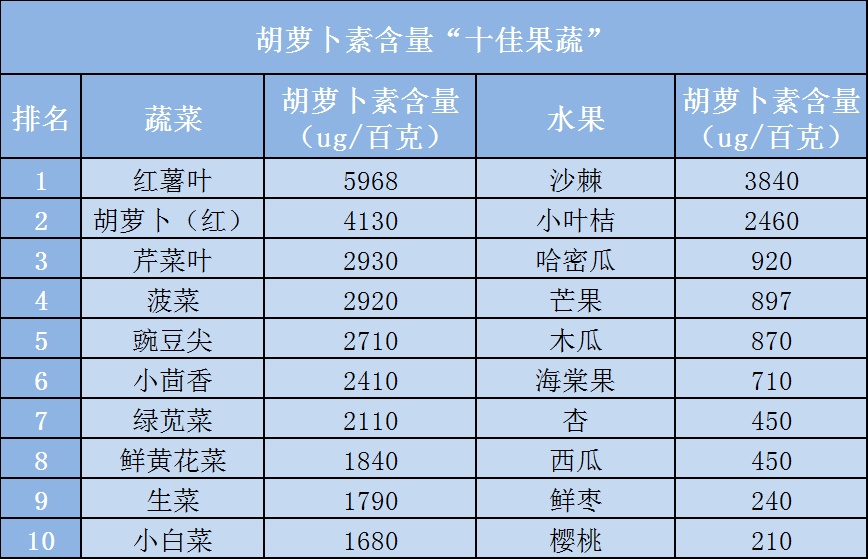 胡萝卜素含量“十佳果蔬”