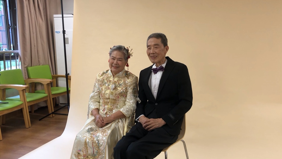 在福利院的支持与帮助下,5对结婚超过50年的夫妇,受邀来补拍金婚结婚照,老人们都非常高兴。施正新老人告诉记者,这是他第一次这样拍照,感觉很惊喜。