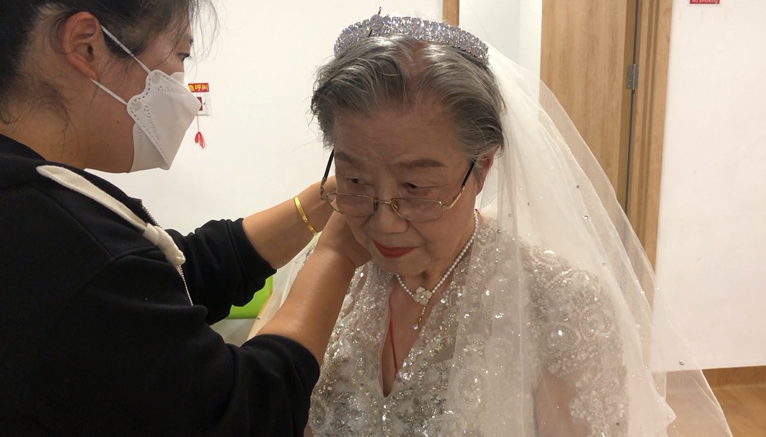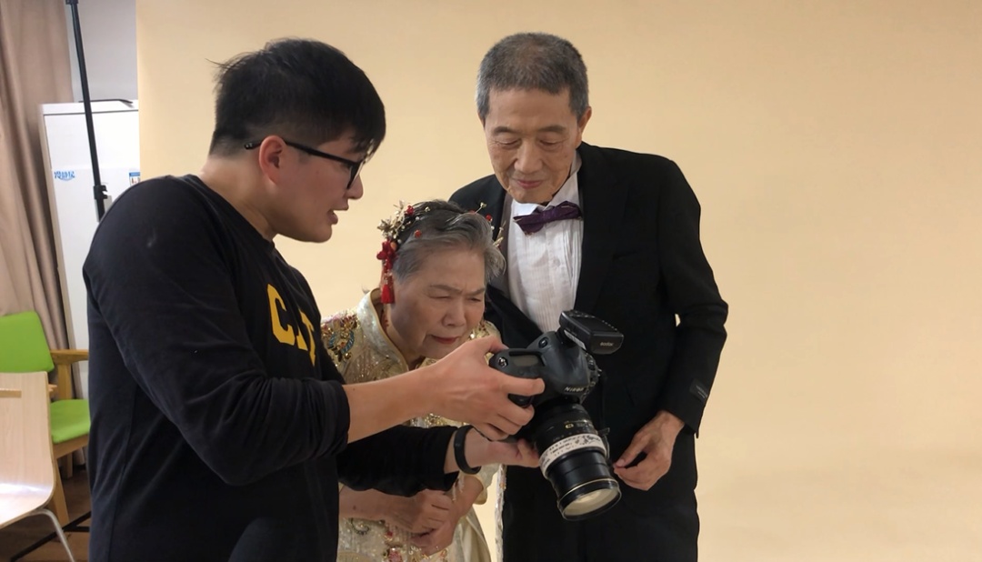 化好妆,穿上婚纱礼服,老人们就可以正式拍照了。“老先生加个领结会更帅气,奶奶您加条项链会更好看。”摄影师也不断为老人们更换拍摄的姿势和角度,希望能拍出各种造型的美照。