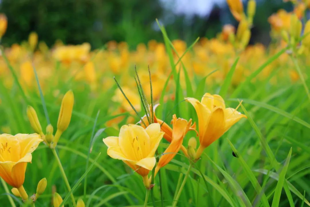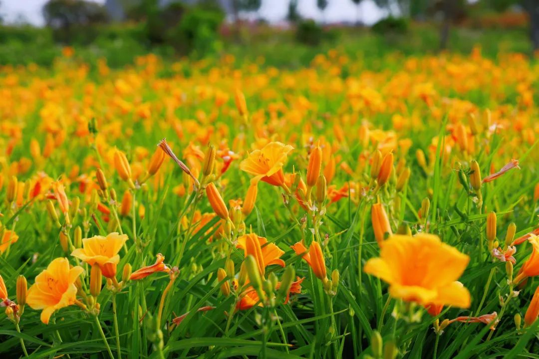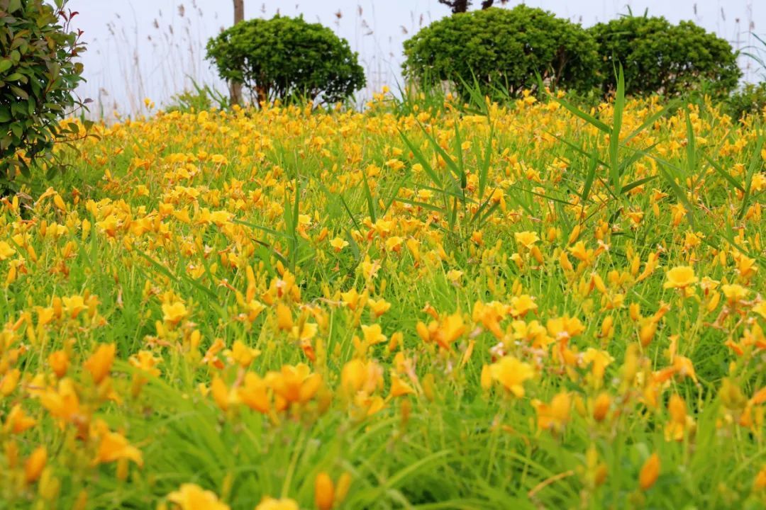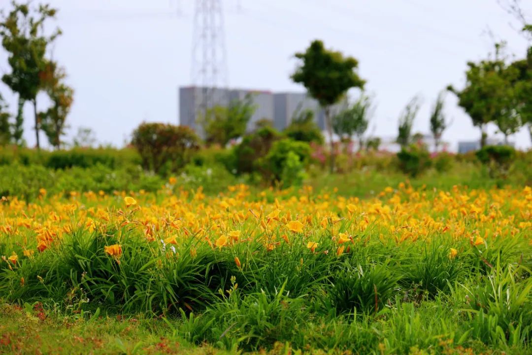 在洞塔路东侧的绿地,塘浚路分隔的南北两侧路口转角,各有一大片萱草花海,美景浮现在眼前。萱草的花型形似百合,一枝花葶上有多个花蕾,这些花蕾陆续绽放,每一朵花都有展示各自美丽的时刻。