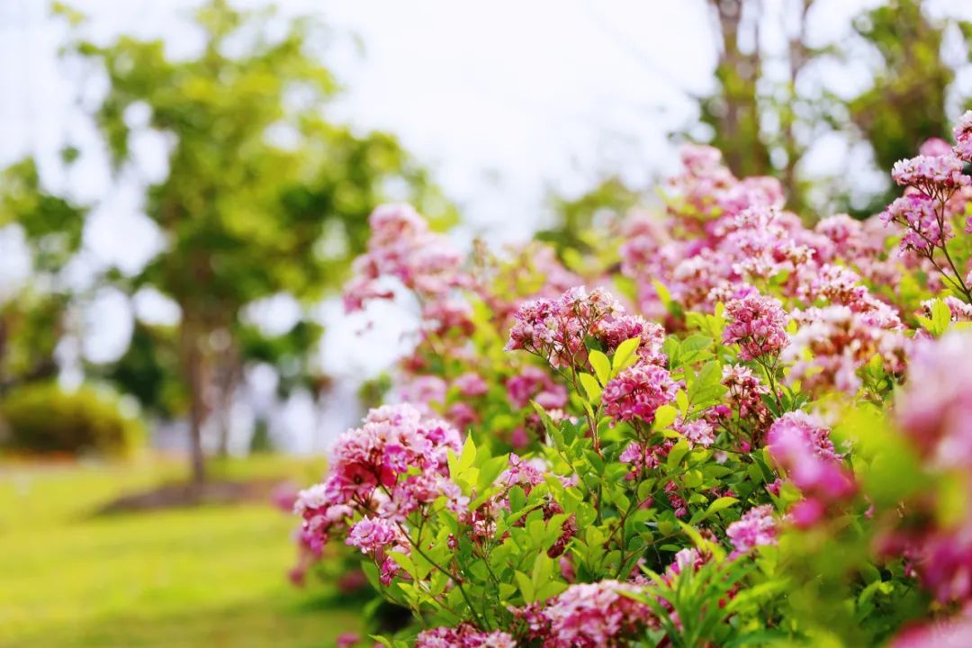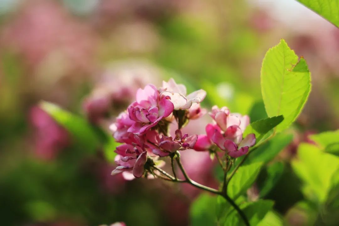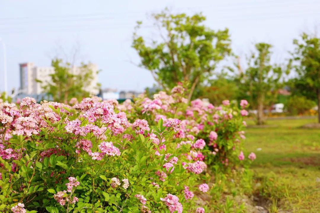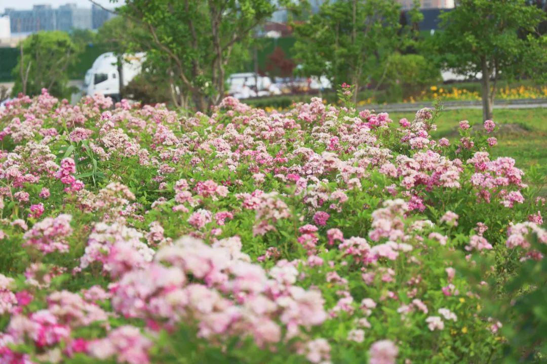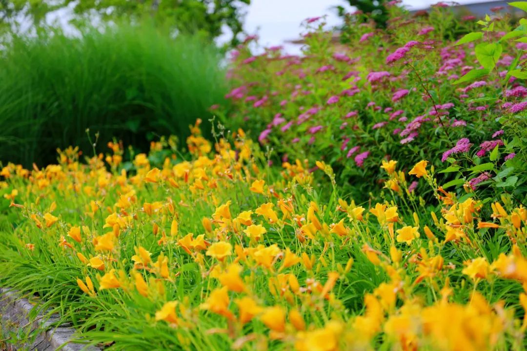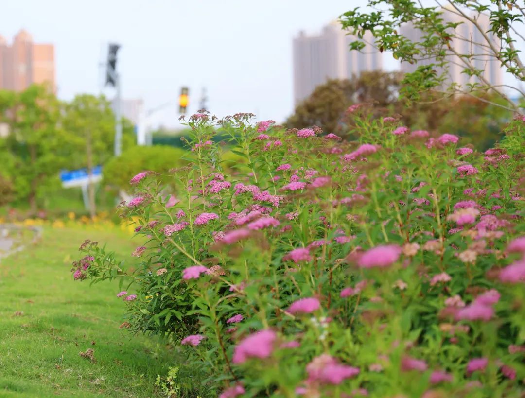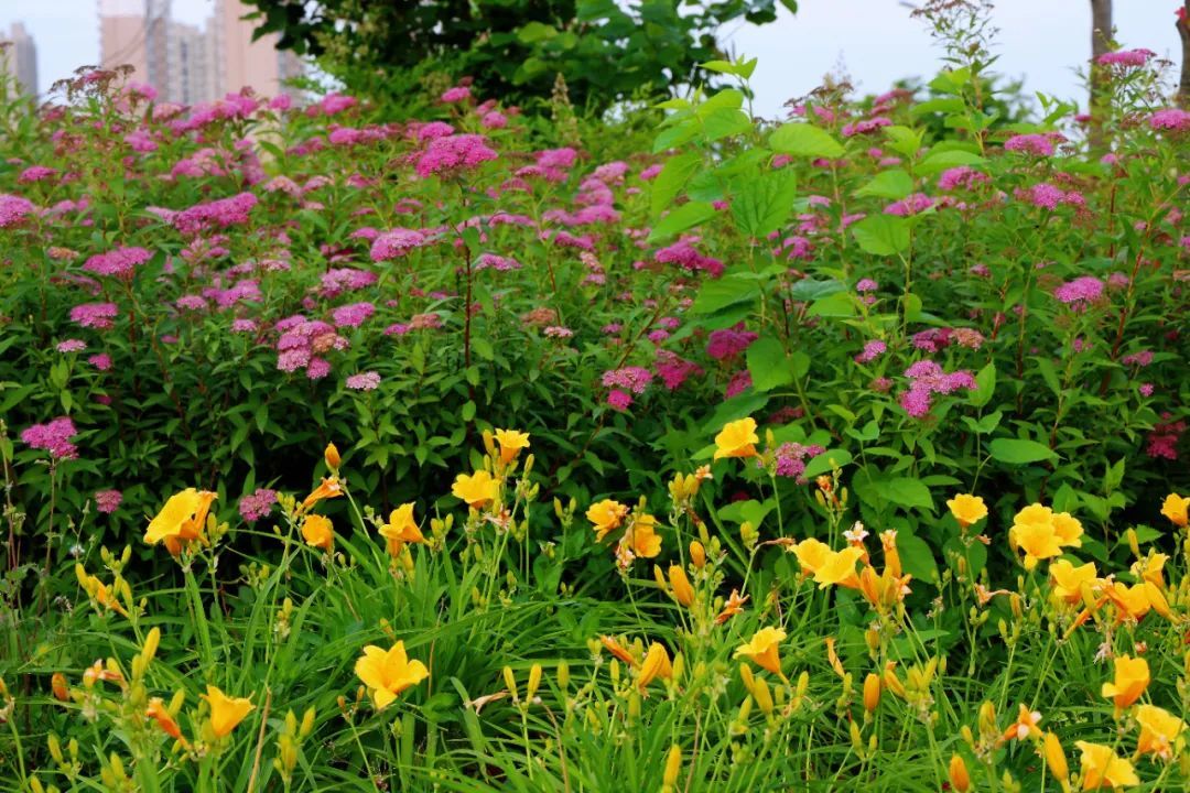 在萱草花海的后方,能看到半人高的灌木,枝条纤细,枝头擎着密密的粉红色小花,挤作一团。这是粉花绣线菊,它耐得住严寒,又特别容易繁殖,起到点缀或映衬的作用,花期长可形成花带,多应用于城市园林绿化建设。