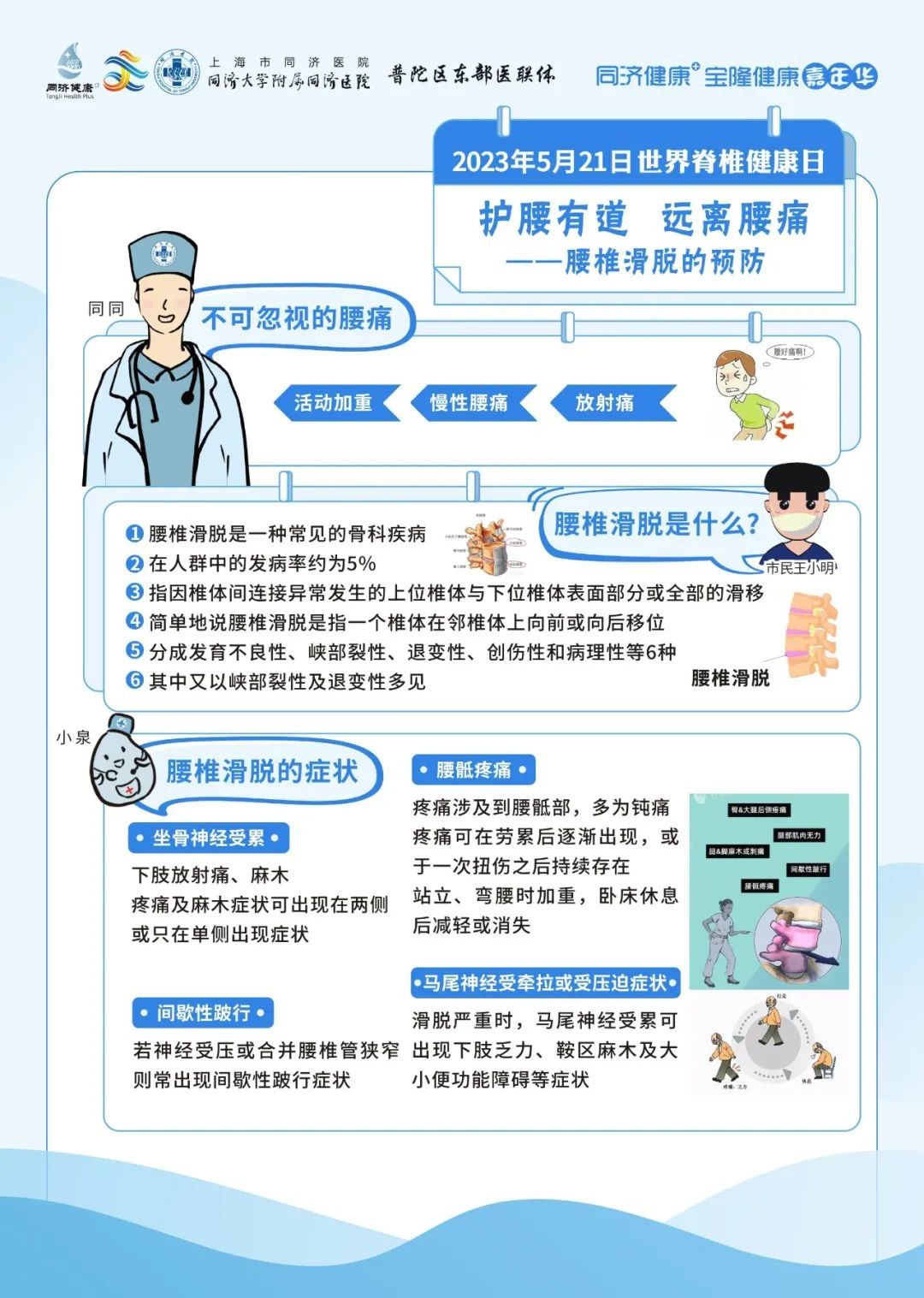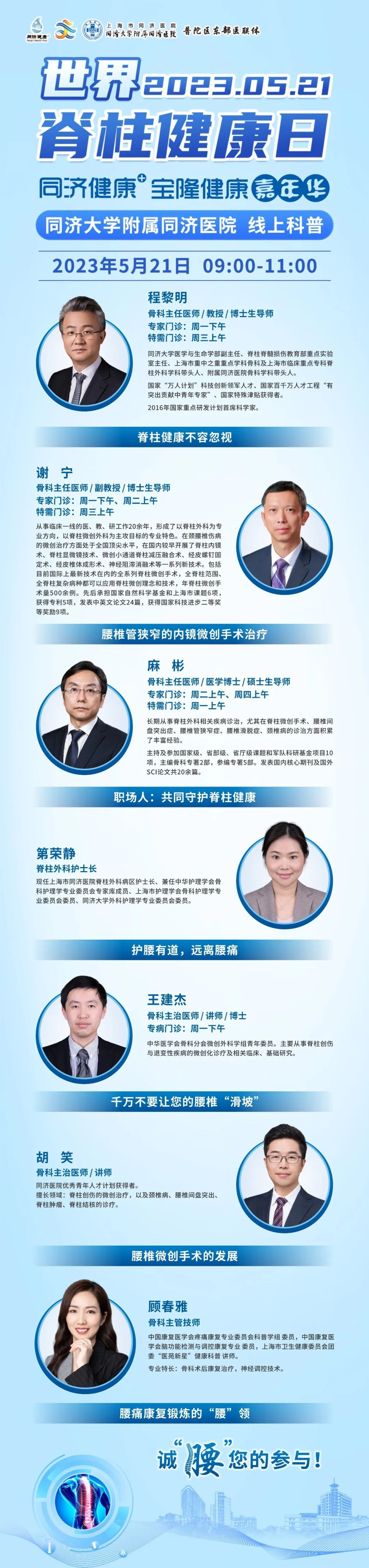 同济大学附属同济医院将于2023年5月21日上午9:00-11:00,由骨科为大家带来脊柱健康的相关科普,教您如何爱护重要的脊柱腰椎。