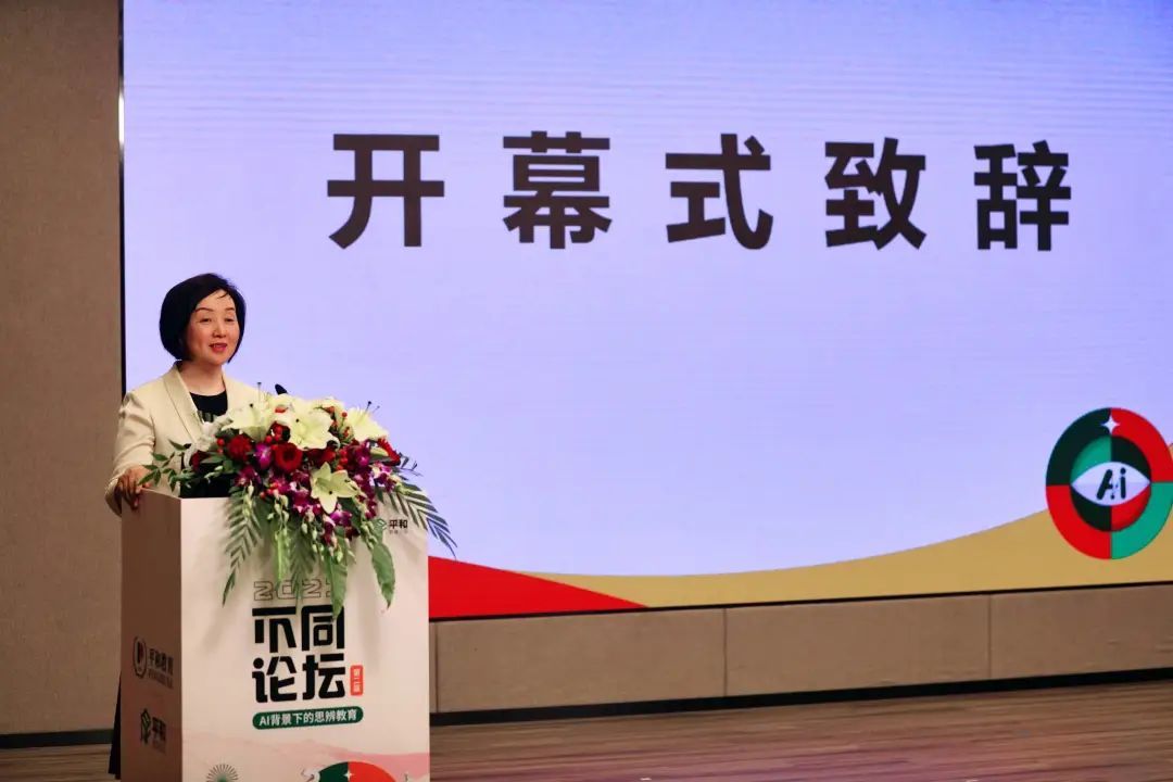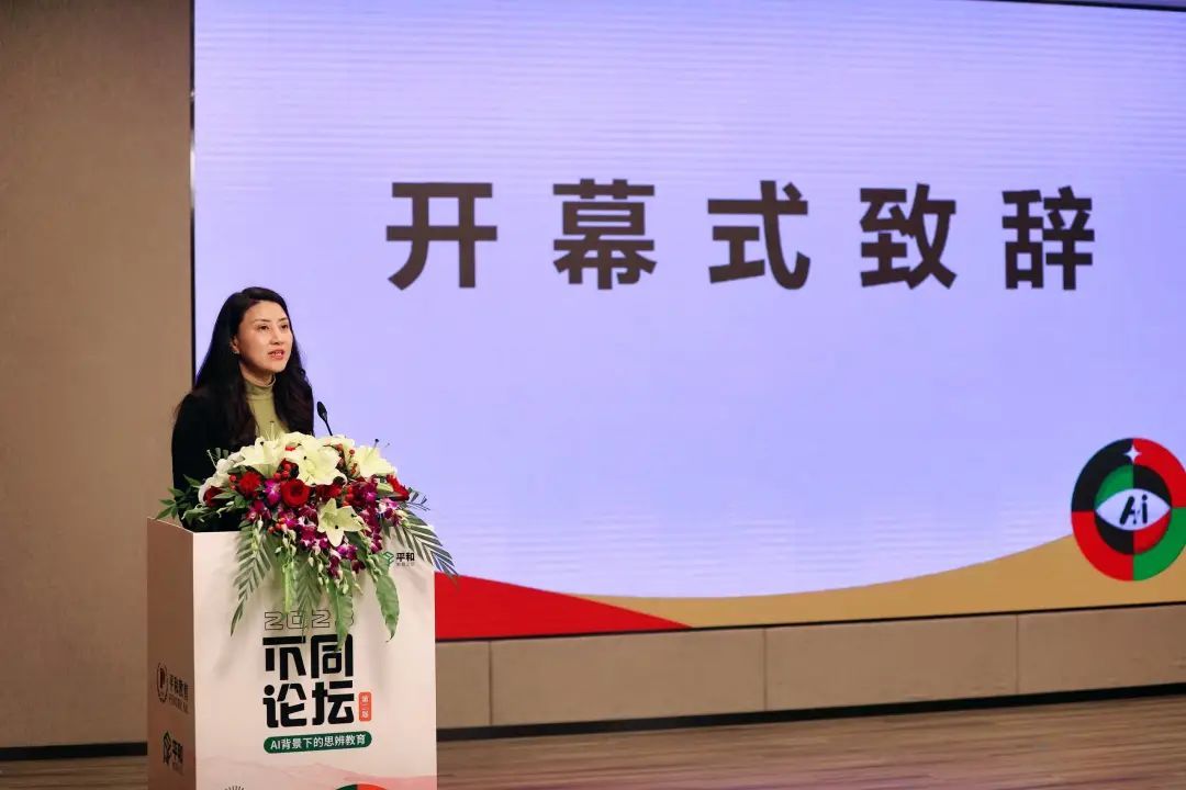 上海平和教育发展集团有限公司党委书记胡悦来致辞。胡悦来用三组关键词来分享她对AI发展与教育面向未来转变的思考,这三组关键词分别是审视与进化、思辨与不同、共创与涌现。