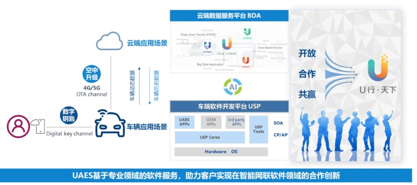 联合电子聚焦“数字化业务”,持续对大数据相关业务进行高投入研发,推出了“U行天下”汽车数字服务品牌。该品牌支持实现涵盖车辆生命周期的数据应用和持续数据价值挖掘,支持从产品设计开发、整车试验、批量生产到售后等环节的数据服务产品,例如动力数据评估、远程标定、效能优化、驾乘体验和健康管理。此外,联合电子在生态方面推出基于整车计算平台的SOA软件开发平台(USP),包括原子服务、基础服务、场景应用和开发工具链,致力于提供智能终端、车辆、云端的智能网联一体化系统解决方案。