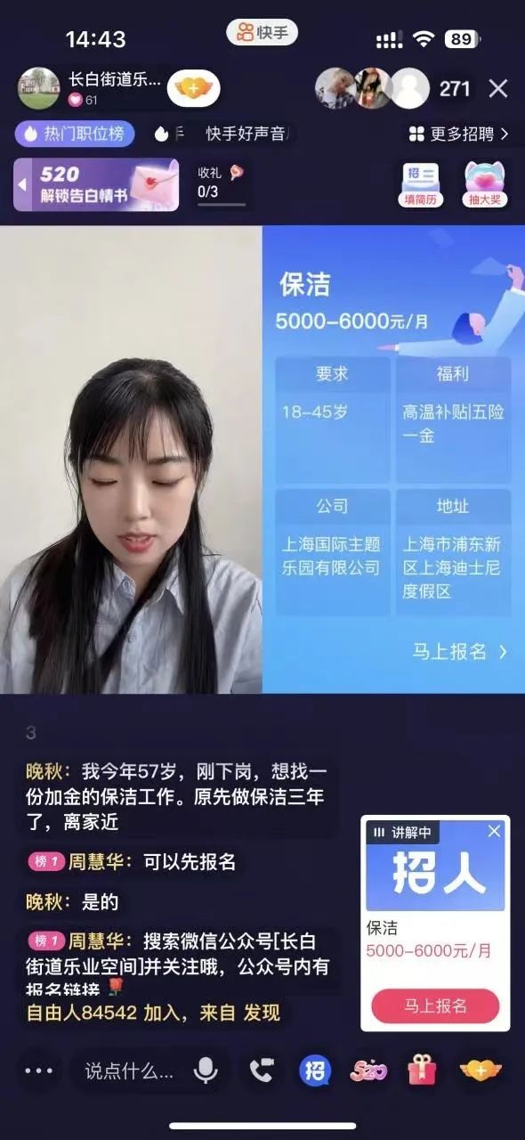 当天下午,在长白街道乐业空间直播间内,乐业空间主持人依次详细介绍了用工岗位、岗位概述、薪资福利等信息。针对直播间公屏上求职者提出的问题,企业招聘代表与乐业空间主持人共同为大家解答疑惑。