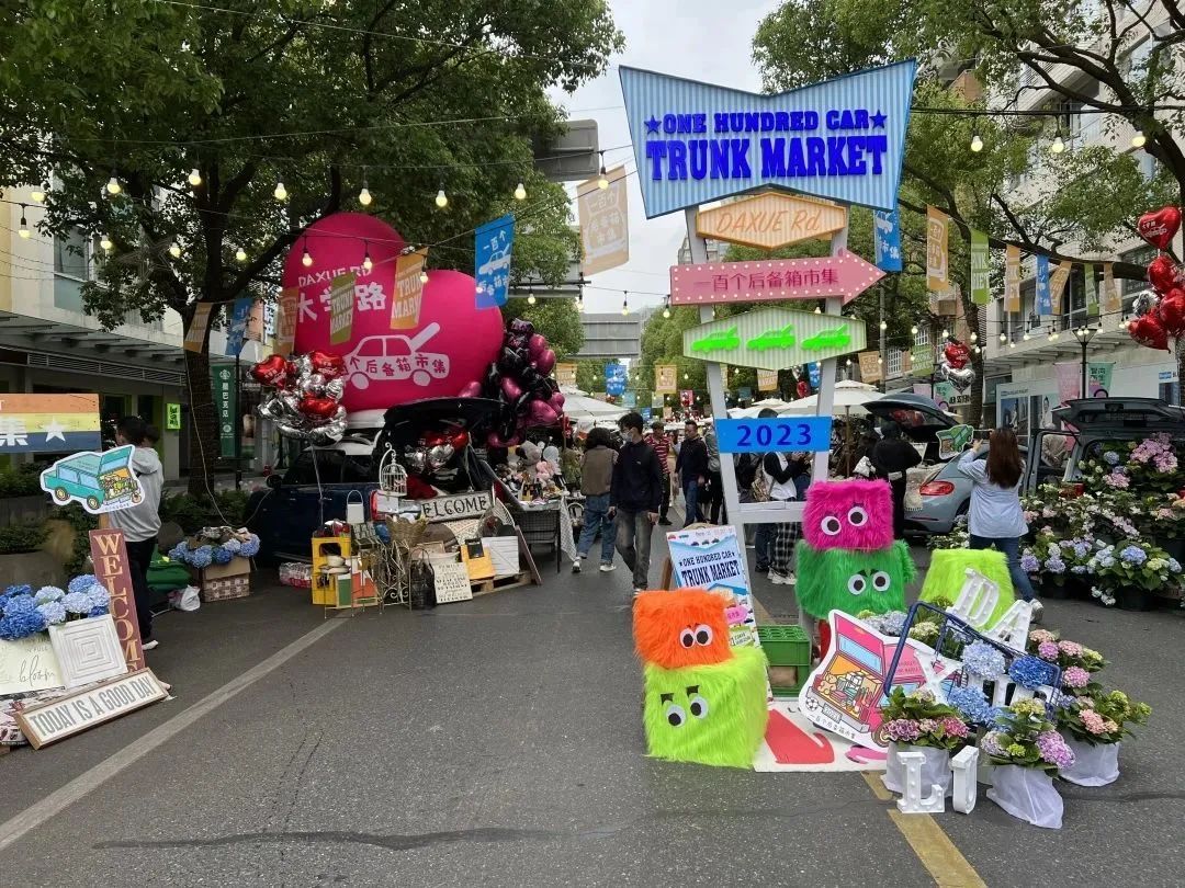 整个市集分“好看好玩区”“环保区”“绿植区”“二手区”四个区域,只见两排私家车停在马路中央,齐刷刷打开后备箱,以一场热闹的市集庆贺着首日的狂欢。