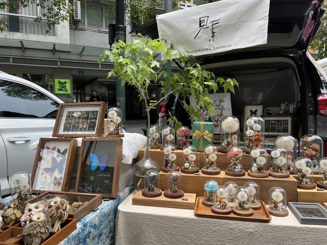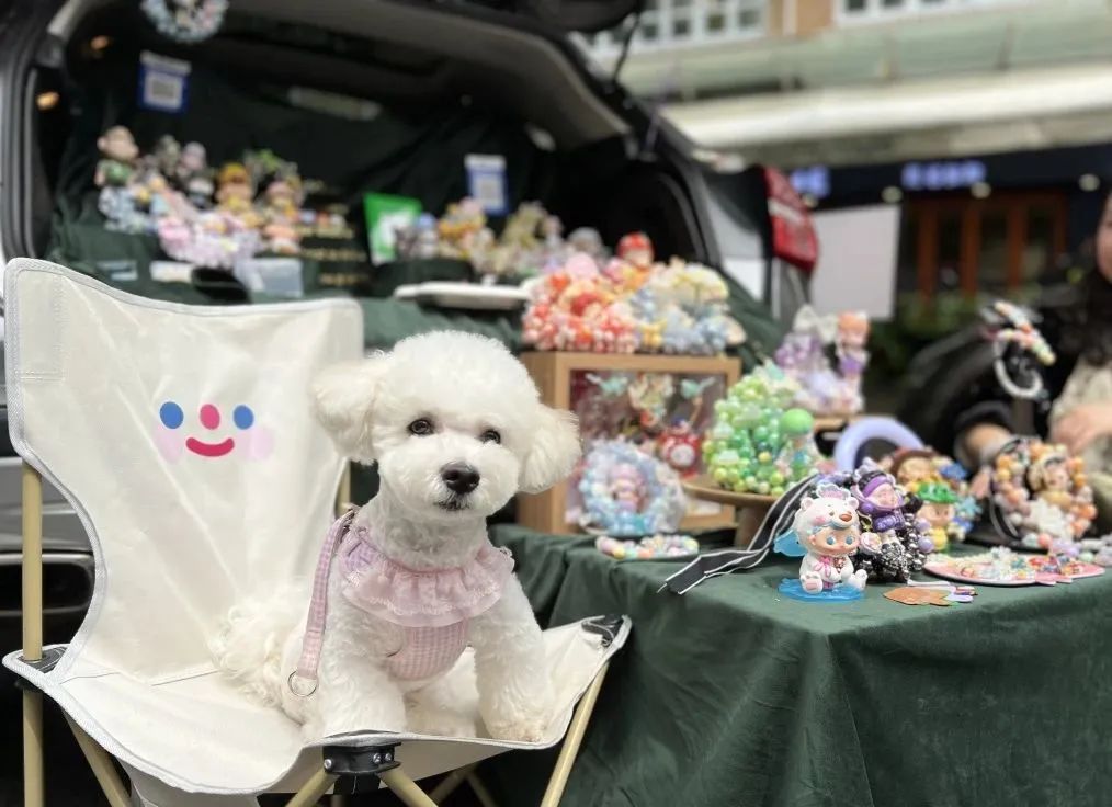 珍珠项链、玩具模型、精致的猫头鹰摆件、蒲公英嵌入的水晶球……各种文创、手工艺品层出不穷,还有可爱小狗来“摆摊”驻场。
