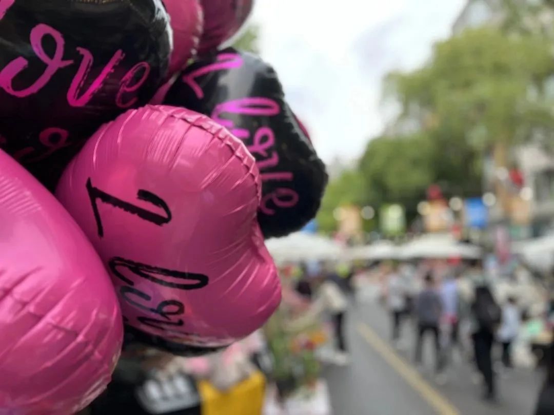 正值“520”,两侧沿街商铺做足了准备。香水店的门口摆出玫瑰模型,寓意花一般的爱情,餐厅则启动各种套餐优惠。