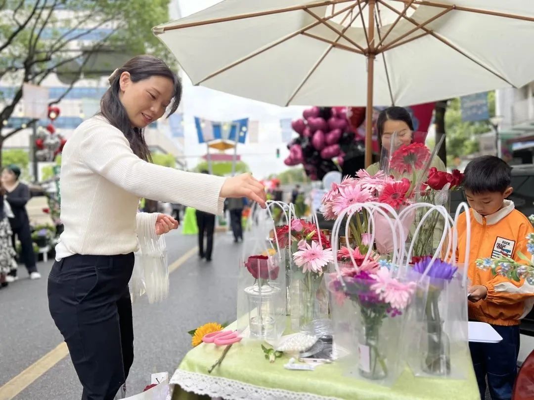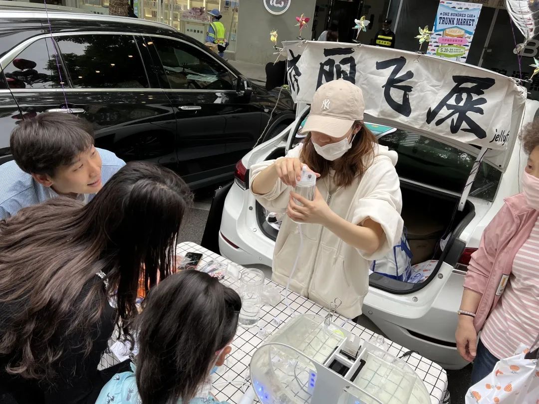 在现场63个私家车摊位里,还有不少摊主是创智坊社区的居民,步行过来不过几百米。比如摆起“爱心义卖”摊位的车主叶晓韵,10元一束向日葵,收入所得均将以不同形式捐助贫困孩子。