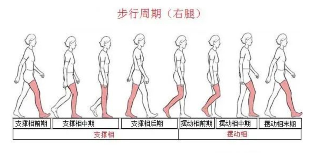 这就是一条腿正常走路的一个周期,两条腿互相交替重复着上述动作,就形成了我们的正常行走步态。