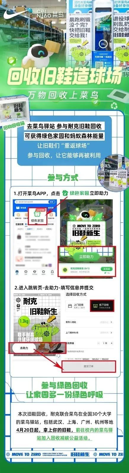 开展本次旧鞋回收活动。同学们可以拿上自己不要的旧运动鞋前往校内的菜鸟驿站,一起加入回收减碳公益活动。