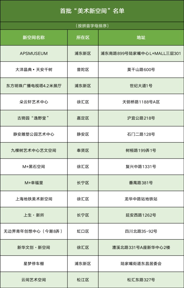 市文化旅游局介绍,首批15个“美术新空间”于日前正式公布。区别于传统的美术馆、博物馆等展示空间,“美术新空间”指在室内或户外的特定空间内,经常向社会公开陈列展示视觉艺术作品的非营利场所。在首批授牌的“新空间”中,既有人气爆棚的“打卡地”,也有在商场、公园中闹中取静的艺术空间,还有与每个人的生活息息相关的公共空间,一起去看看吧↓
