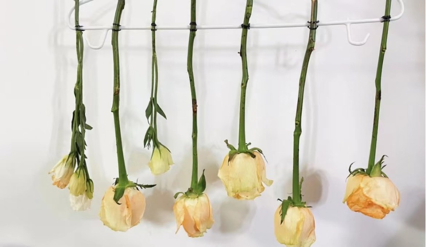 ·醒好花后,捞出沥干,去除枝条上多余的叶片,以免花朵争夺水分和养分,只需留1到2片叶子点缀即可。