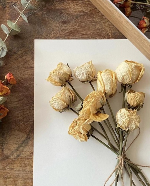 风干后的鲜花,可以把颜色好看,花瓣大的花放最上层,制作精美的干花花束装饰画。切记,不要把没有完全干透的花装相框里,容易发霉影响美观。干花处理完成后,可用胶枪把每一朵花都滴上胶水,粘到相框内进行固定,防止装框时干花散开。此外,在剪花枝时需注意安全,干了的花枝很硬,避免受伤。