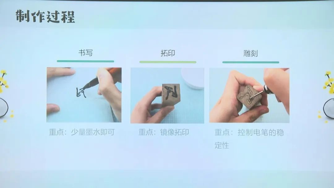 印章制作结合了书法艺术与篆刻技艺,蕴含着极强的文化价值,载体以金、铜、银、石、泥、角、竹、木、牙等材料为主。其中木质印章最为普及,材料易得好上手,是近年来老少皆宜的群众文化娱乐活动。张紫千表示,“这次只是第一场活动,后续我们也会根据甲骨文展出的进程,设计更多不同的、更有意思的活动。”