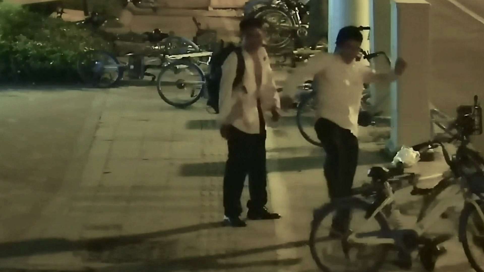 芷江西路派出所调查发现,凌晨0点左右,两名身穿白色衬衫的年轻男子在路口的东北角,使用推倒、踢踹、摔打的方式,损坏多辆非机动车及两个花盆,整个过程持续了半个多小时。随后两人进入了西藏北路一小区内。