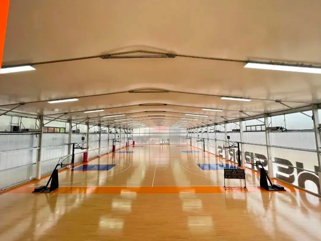 场馆采用铝合金结构和膜结构,配置中央空调保证全年恒温运动,龙骨+专业运动木地板提供弹性支撑,配备青少年场地及独立看台。