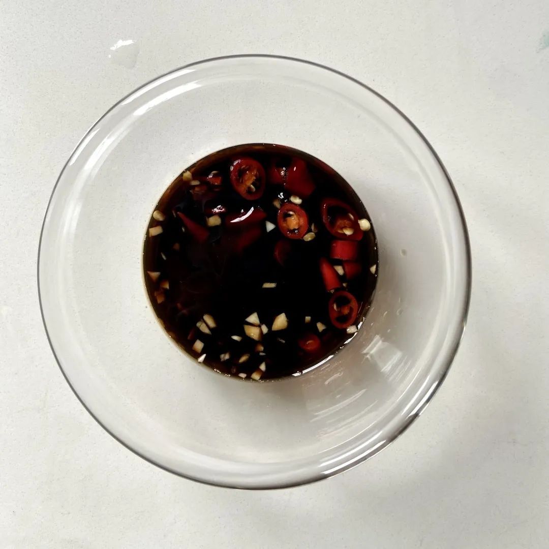 2.小米椒、大蒜切碎,加入生抽、蚝油、糖,搅拌成酱汁备用。