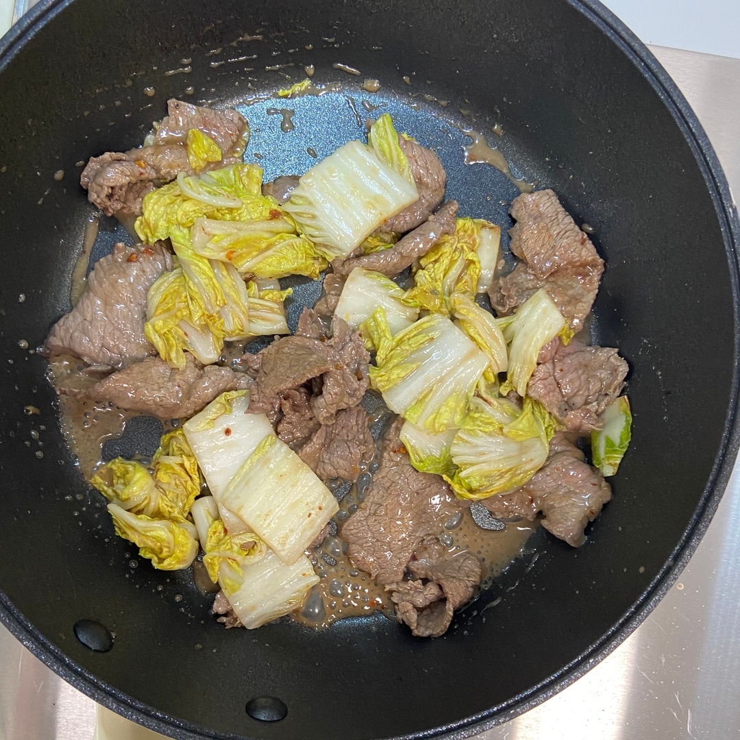 4.腌制好的牛肉倒入锅中翻炒,变色后加入娃娃菜炒熟。