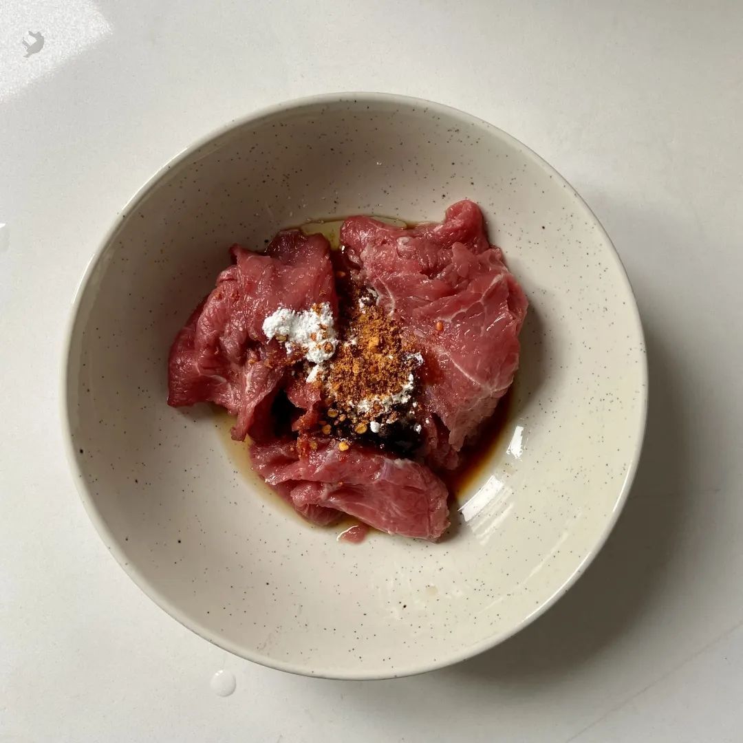 1.牛肉加入淀粉、生抽、蚝油、辣椒面抓匀,腌制10分钟。