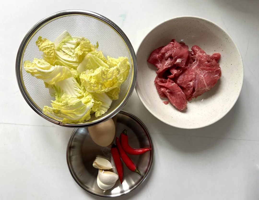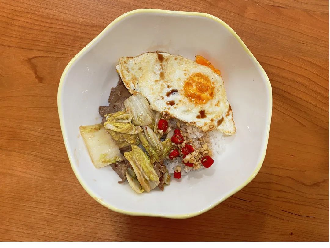 牛肉片、米饭、娃娃菜、鸡蛋、小米椒、大蒜、生抽、蚝油、辣椒面、淀粉、糖