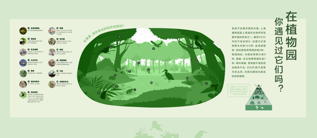 在上海植物园里,与植物原住民相伴的,还有数不清的动物邻居。它们有些生活于此,有些则是在特定的季节造访上海,在植物园旅居数日。通过开展持续的生物多样性监测,植物园背后这张看不见的生态之网逐渐展现在我们面前。