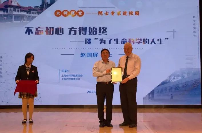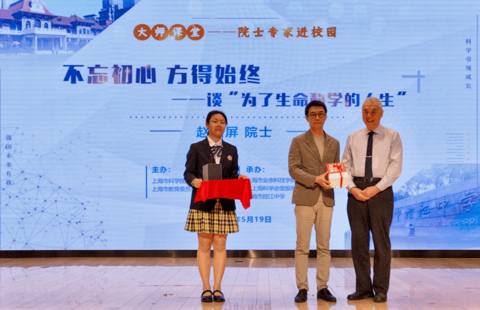 报告前,上海市科协副主席倪前龙为赵国屏院士颁发了“大师课堂”授课证书,赵院士也向学校赠送亲笔题词的科学书籍,控江中学校长则向院士回赠了控江中学校徽和文创产品。