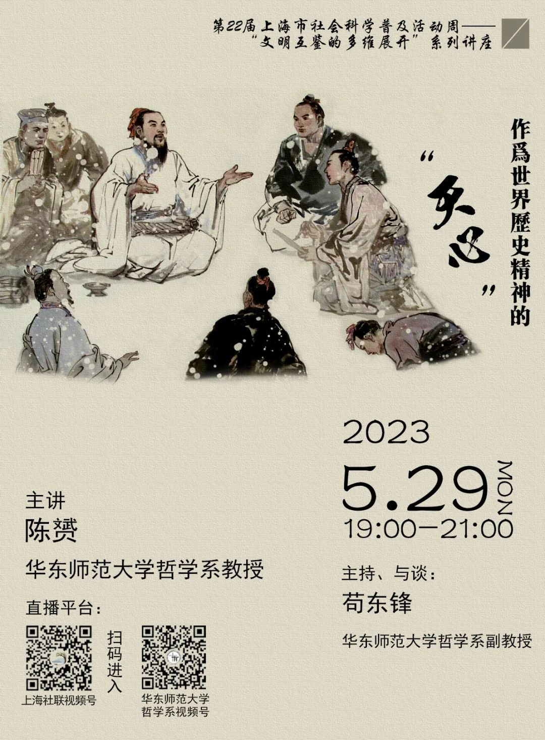 2023年5月27日至6月2日,由上海市社会科学界联合会主办,华东师范大学中国现代思想文化研究所联合上海中西哲学与文化比较研究会、华东师范大学中国智慧研究院、华东师范大学哲学系、冯契学术成就陈列室共同承办的第22届上海市社会科学普及活动周——“文明互鉴的多维展开”系列讲座,面向高校学生与社会大众,同时在学术上体现“新文科”文史哲艺会通的特点,从哲学、历史、文学、美术、设计、科技等角度阐明文明互鉴在不同领域和不同维度的展开,既有普及性又有思想深度。邀请您跟随专家学者们的讲述一起来思考和交流。