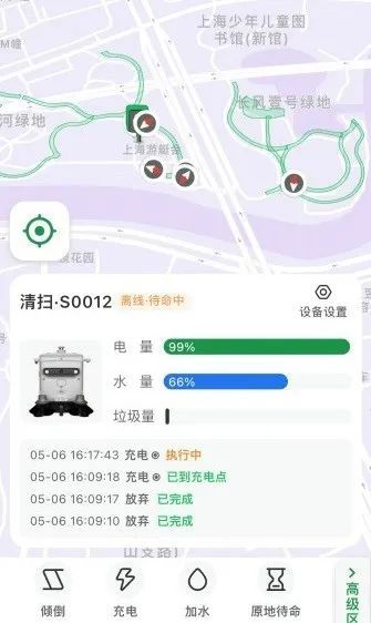 智慧公园保洁项目依托半马苏河公园,以公园内部道路作为试点,通过智能小型保洁设备替代原人工使用扫帚开展道路清扫保洁作业模式。智慧保洁管理平台的建立,通过大型数据库,对车辆行驶的实时位置、作业情况、任务调度等进行全过程实时管控。