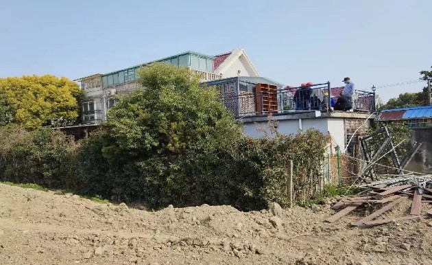 此前,嘉定工业区拆违办土地巡查员发现,在泾河花园别墅边的一处空地上有一栋私自搭建的房屋。现场,钢结构围挡立柱已完成搭建。“两处违建面积约200平方米,均在区出让土地地块上。”嘉定工业区城管中队队员丁晟说。