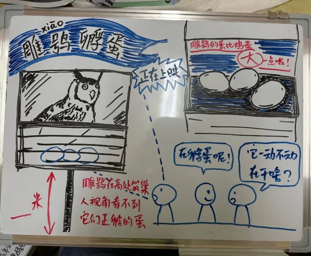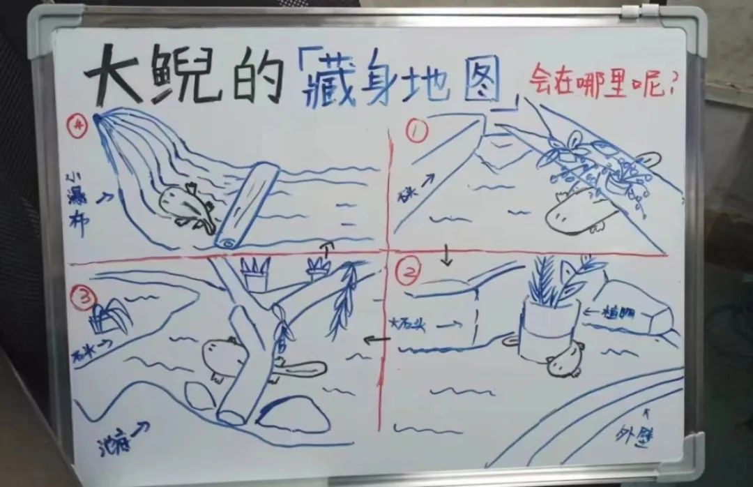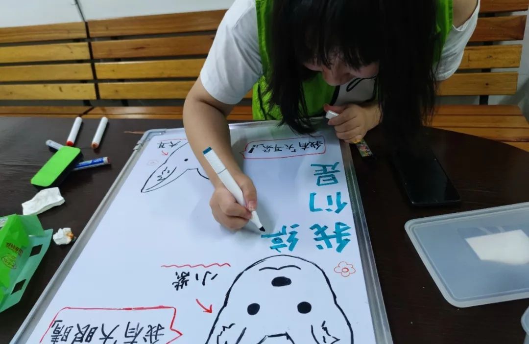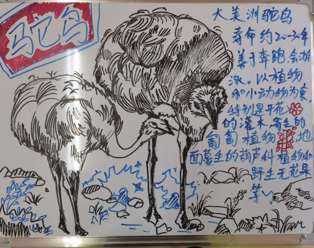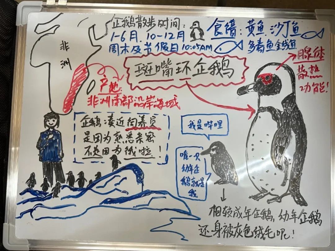 绘画志愿者会来到各个动物展区与饲养员进行深入交流,对动物的特征、习性、性格、喜好,以及动物展出的实际情况等诸多信息进行“摸底”,随后整合收集到的信息,在小白板上进行设计和创作。