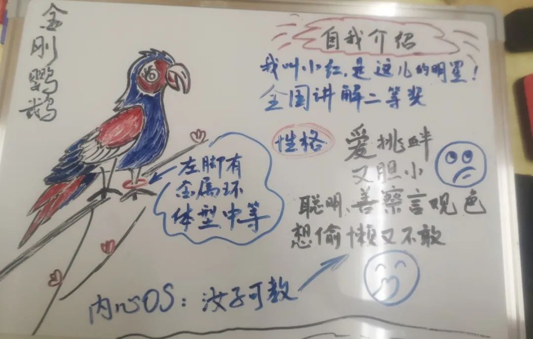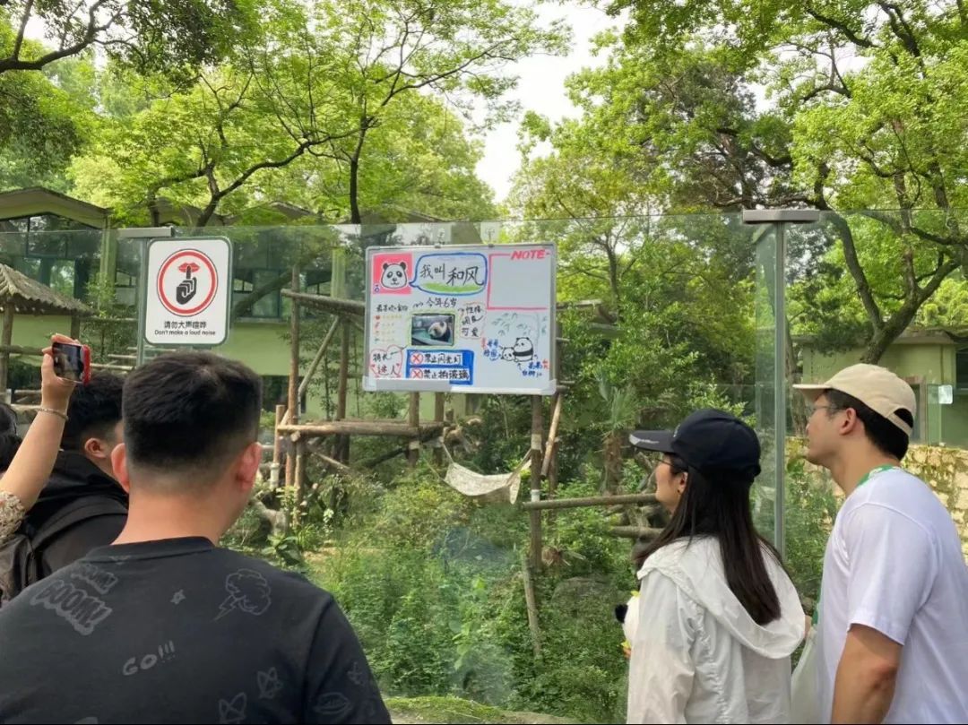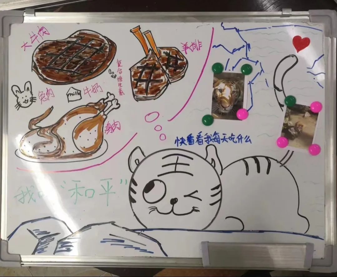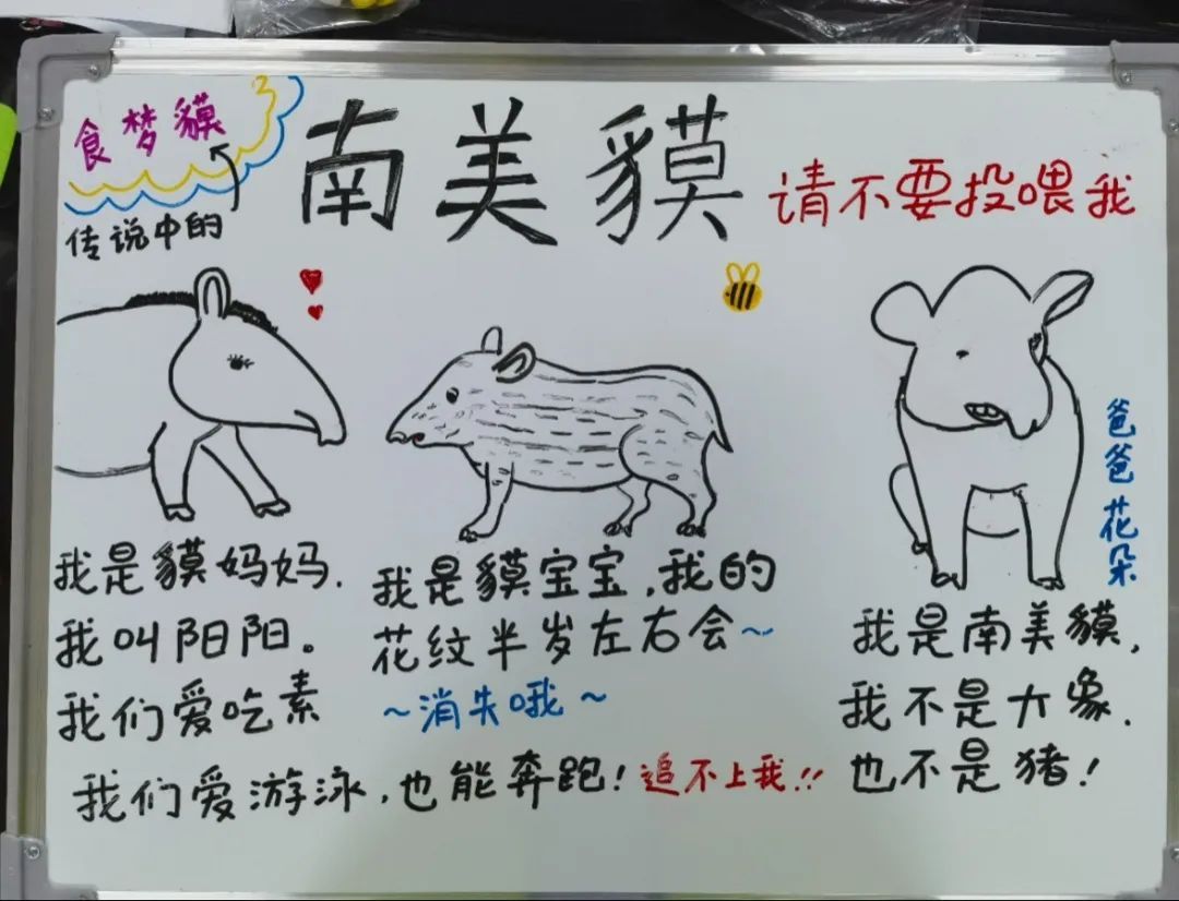 今年3月,在乡土动物区的金钱豹展区出现了第一块可移动的科普版面,饲养员在白板上介绍了当天展出的一头雄性金钱豹的呼名、年龄、性格,喜欢休息的区域,以及生活习性。游客看到板上的内容会呼唤动物的名字,反响良好。接着,虎展区、大熊猫展区都陆续出现了饲养员亲自手绘的可移动的科普版面,游客纷纷拍照留念。