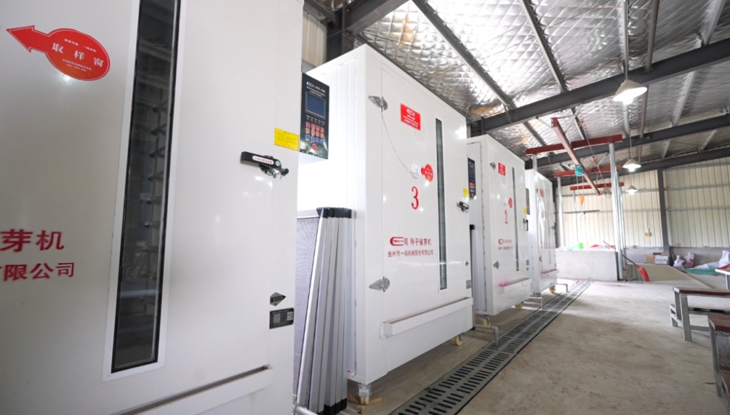 智能催芽设备马力全开,全自动流水线高效运转,凌晨5点的基地已是一片忙碌景象。谷种经过浸种池72小时的消毒和浸泡,由机械抓手自动抓取,转移到相应托盘上,再由叉车转运到育秧催芽机进行催芽。催芽完成的秧苗则经过摆盘、铺土、注水、置种、覆土五道工序,快速制成一个个秧盘,随后还要进行2天的暗化处理,以提高种子的出苗率。
