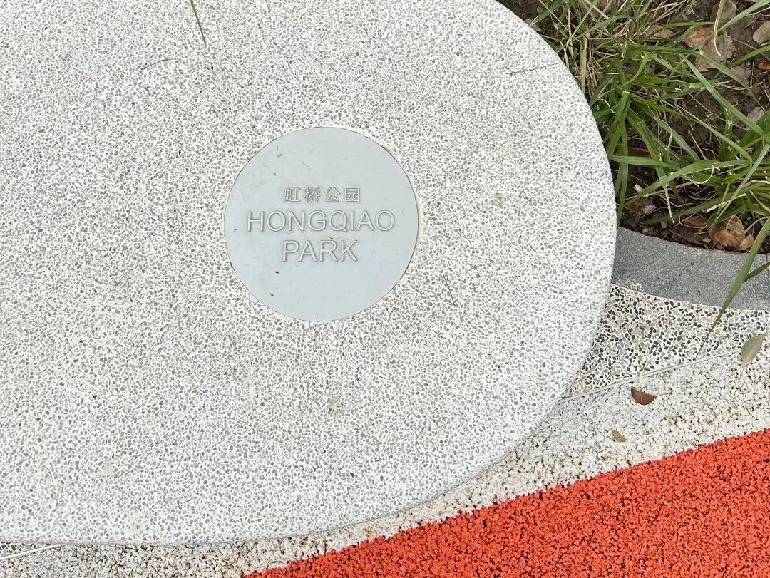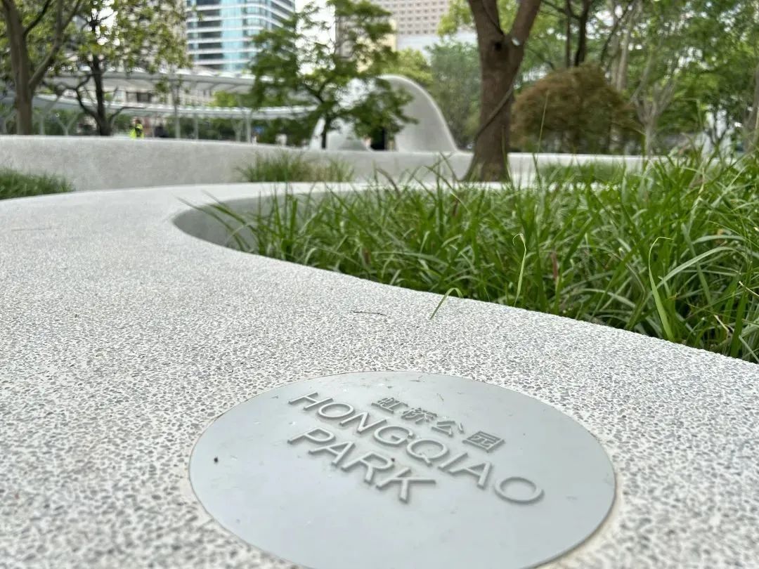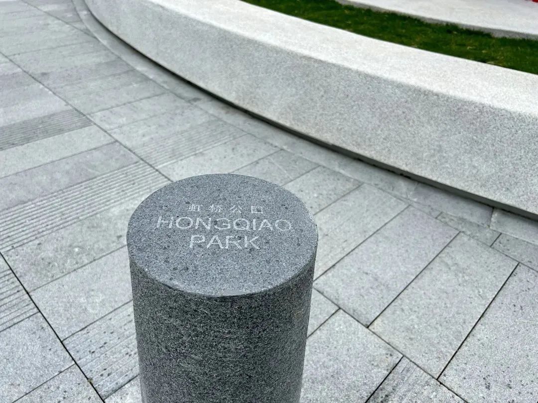 公园的角落遍布“小惊喜”,传递的是人民城市精细化治理的温度。在公园入口处的石立柱顶部,设计者用贴近柱体材质的浅灰色镌刻了有“虹桥公园”“HONGQIAO PARK”字样的中英文logo,以别致、活力的“新图景”打开公园的大门。