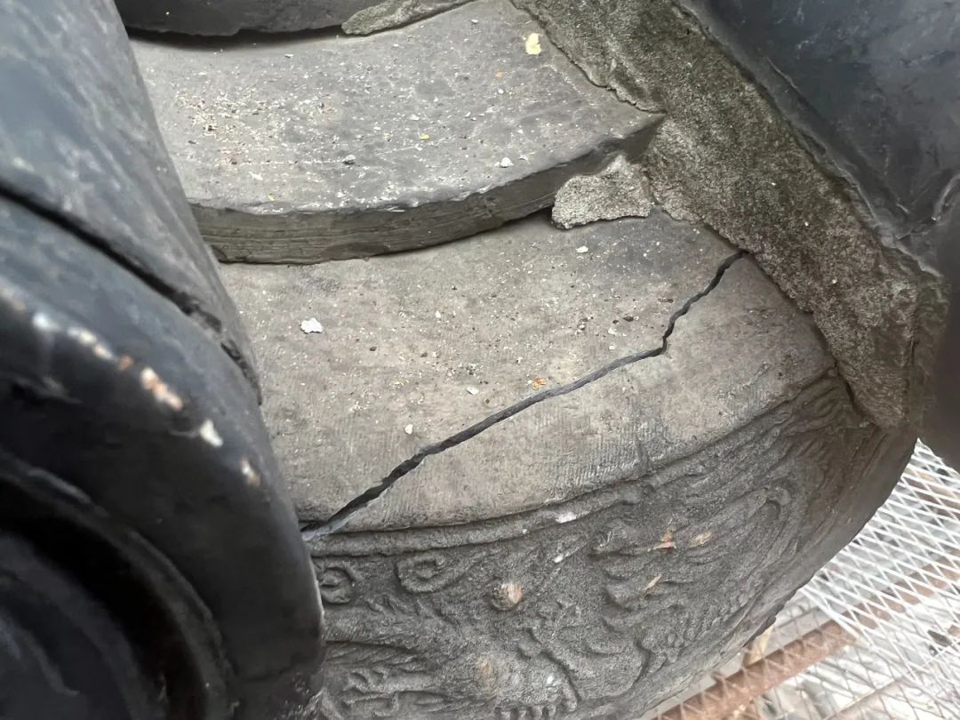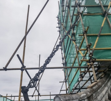 而由于原先的刹链较细,部分区域极易出现断裂,修缮时,相关技术人员按现存材质和形制进行补配,配制铁链所用的铁环由人工锻打而成,并进行做旧处理,使其表面具有一定的粗糙、凹凸感后再作全面防锈处理。