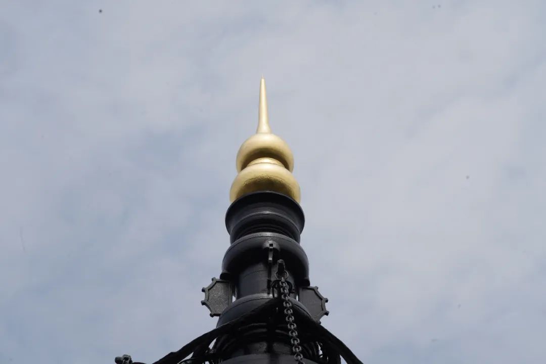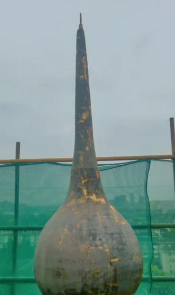 “塔刹整体加固、扶正,‘宝葫芦’原来贴金的部分已经基本上看不出来了,我们的工人爬上去前后刷了三四遍金漆,反复打磨,最后再贴金箔,还原其始建之初的样貌。”现场技术负责人钱雨润介绍。