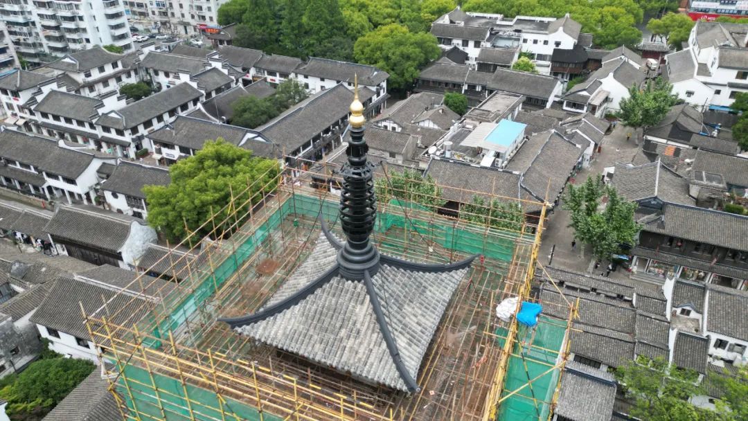 从空中俯瞰,法华塔的塔刹、七层屋面已经修缮完成,塔顶脚手架全面拆除,塔尖的“宝葫芦”重现金色光晕。