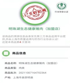 通过建立质量追溯系统,市民可使用微信扫描产品二维码标识,查看种养殖生产、加工等信息。所有生猪出栏上市前,均由区疫控中心开具“检疫合格证明”,注明数量、启运与到达地点、牲畜耳标号等数据。此外,公司定期将猪肉和年度收割的稻米送入第三方检测机构进行检测,进一步确保产品质量达标,合格率为100%。