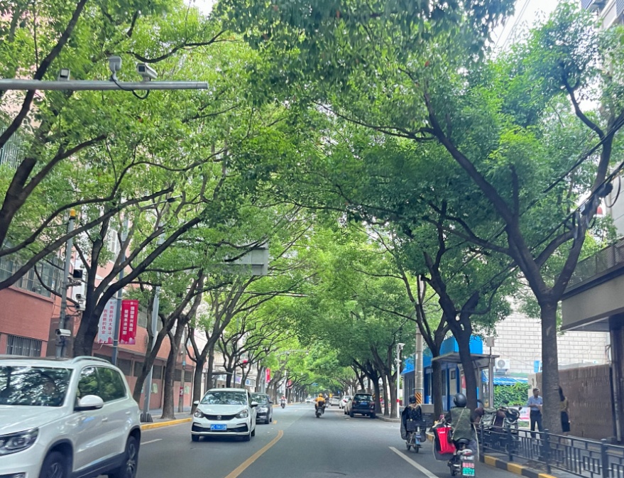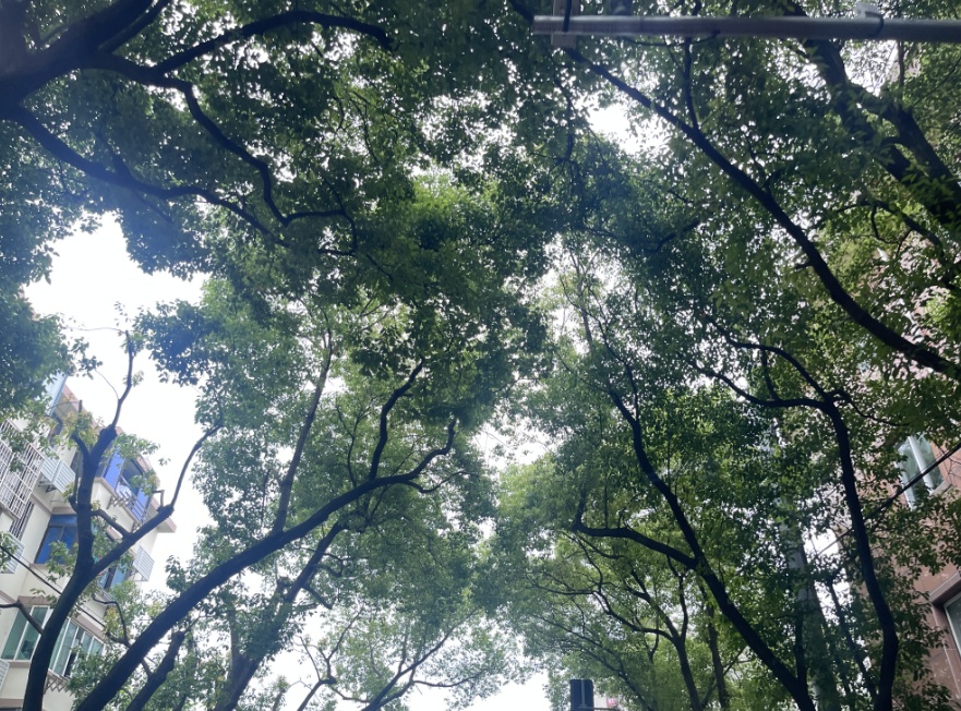 在育秀路上,大部分的阳光都被大树遮挡,犹如一把天然的“遮阳伞”为人们遮挡盛夏烈日的烘烤。