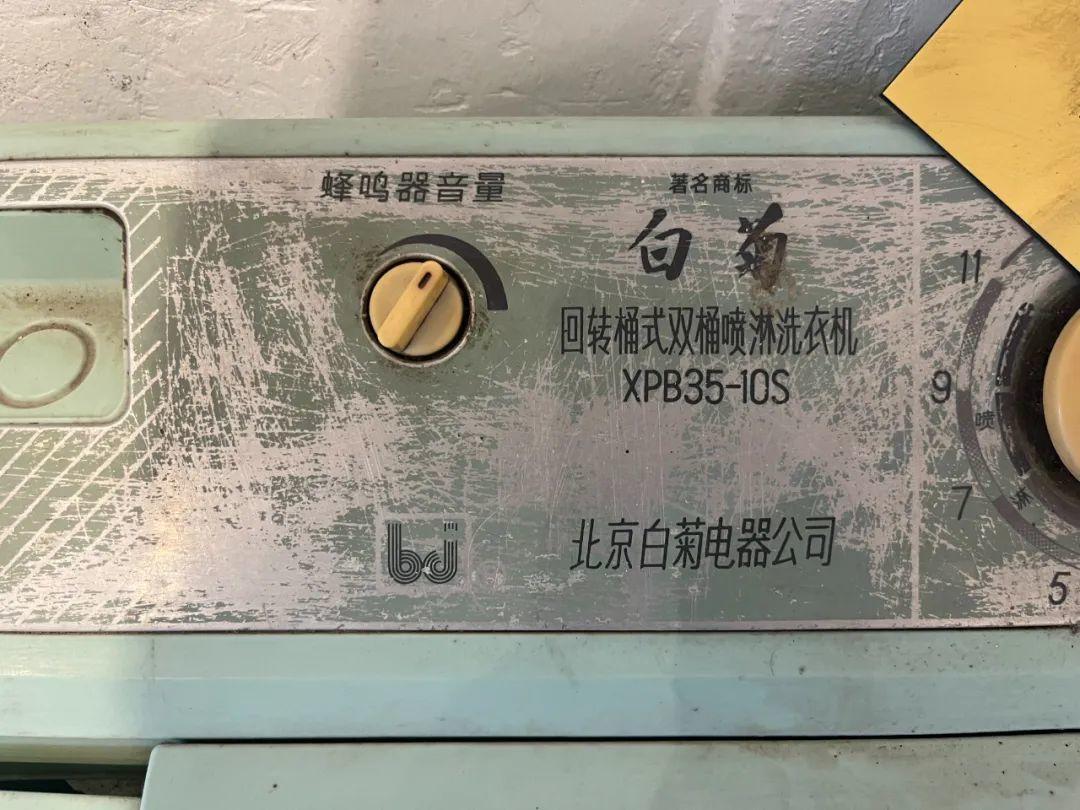 这台洗衣机是“白菊”牌。1982年,北京市洗衣机总厂建厂,1983年开始生产“白菊”洗衣机。1985年,北京市洗衣机总厂生产的“白菊”牌洗衣机获轻工部优秀新产品一等奖。同年,出口“白菊”牌洗衣机5000台,1986年,出口了10000台。