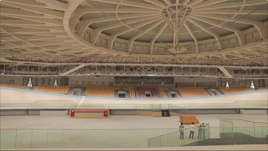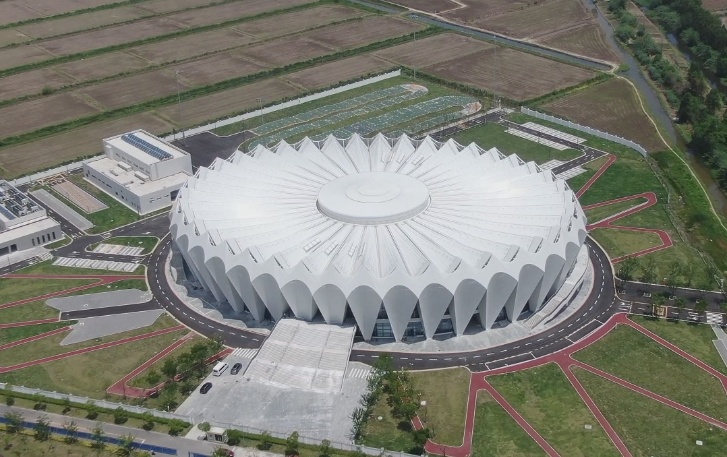 场馆造型格外吸引人眼球。主体建筑从结构原型、建筑外观等多方面重构“自行车车轮”的意象,诠释自行车运动的速度感;立面采用双曲内凹曲面的造型,形成富有韵律感的整体形象,诠释芦苇的意象。