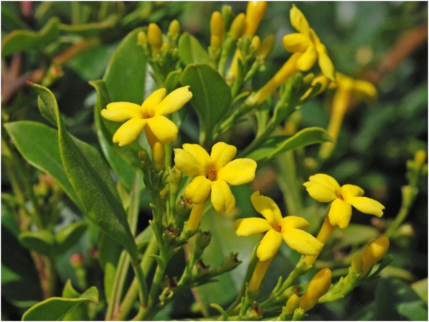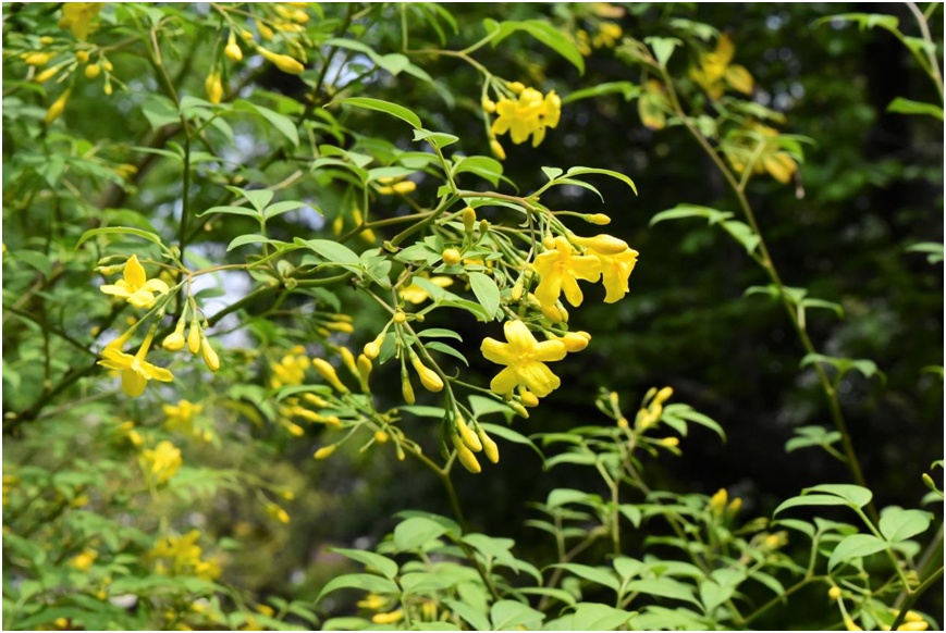 浓香茉莉枝条较粗壮,可直立生长,羽状复叶,小叶5枚或3~7枚,叶互生。花黄色,芳香,成顶生聚伞花序,花期5~6月。习性同云南黄馨。
