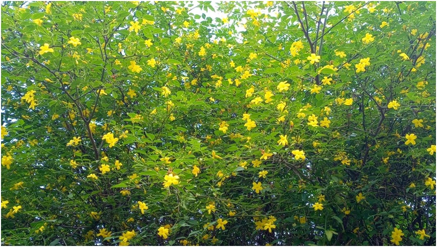 最近几年上海进入了暖冬时期,浓香茉莉每年都保持了冬季不落叶。初夏时节,浓香茉莉黄花朵朵,挂于小枝顶,金灿灿一片,煞是好看。