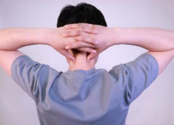 具体操作如图,双手四指交叉抱住后枕部,拇指向下,指腹按颈椎两侧风池穴(在项部,当枕骨之下,与风府相平,胸锁乳突肌与斜方肌上端之间的凹陷处)不动,头部缓慢后仰,拇指下有酸胀感后回到原位,反复3次。