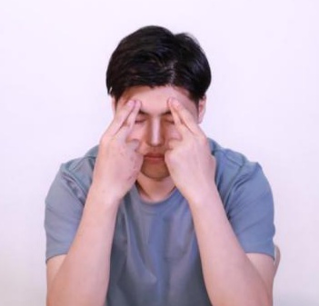 具体操作如图,双肘支撑在桌子上,双手相合。拇指指腹前三分之一放在睛明和攒竹穴之间的内眼眶上,头微微前倾,将重量轻轻压在拇指上,局部酸麻胀即可。双拇指做小幅度的微微环旋按揉,操作30秒。